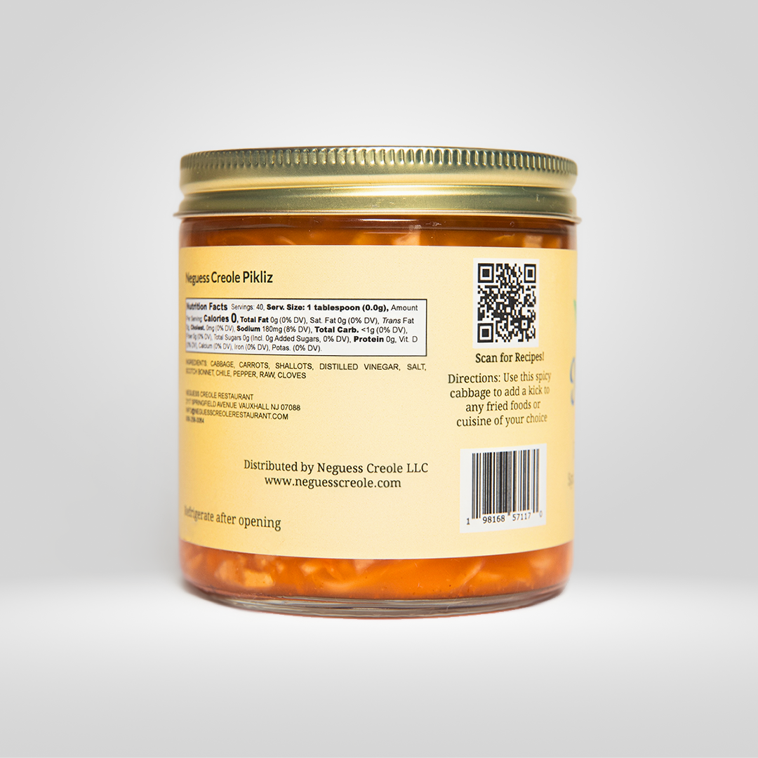 Add a zesty, fiery kick to your meals with our traditional Haitian Pikliz. Made with hand-picked peppers and fresh vegetables, it’s the perfect topping for griot, fried fish, or sandwiches. Enjoy a true taste of Haitian street food with every bite!